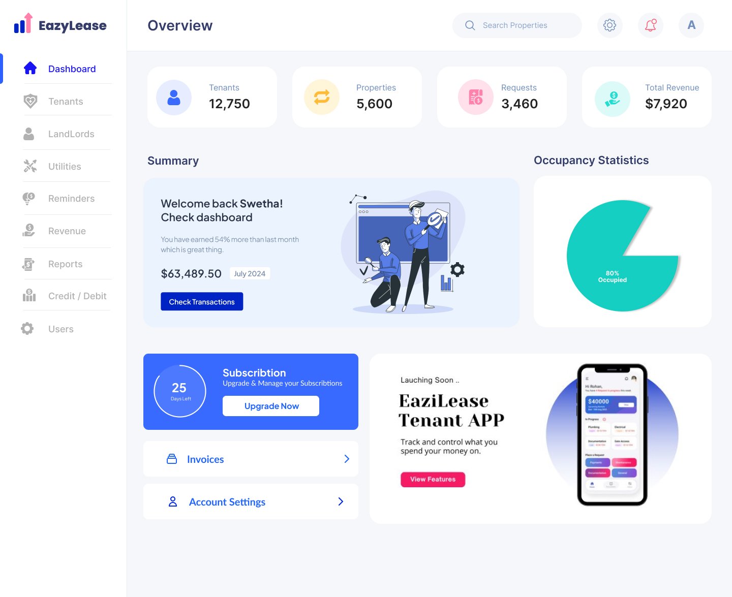 EaziLease grows with you, whether you're managing a single unit or a large portfolio, letting you add properties, users, and features without changing platforms or losing data.